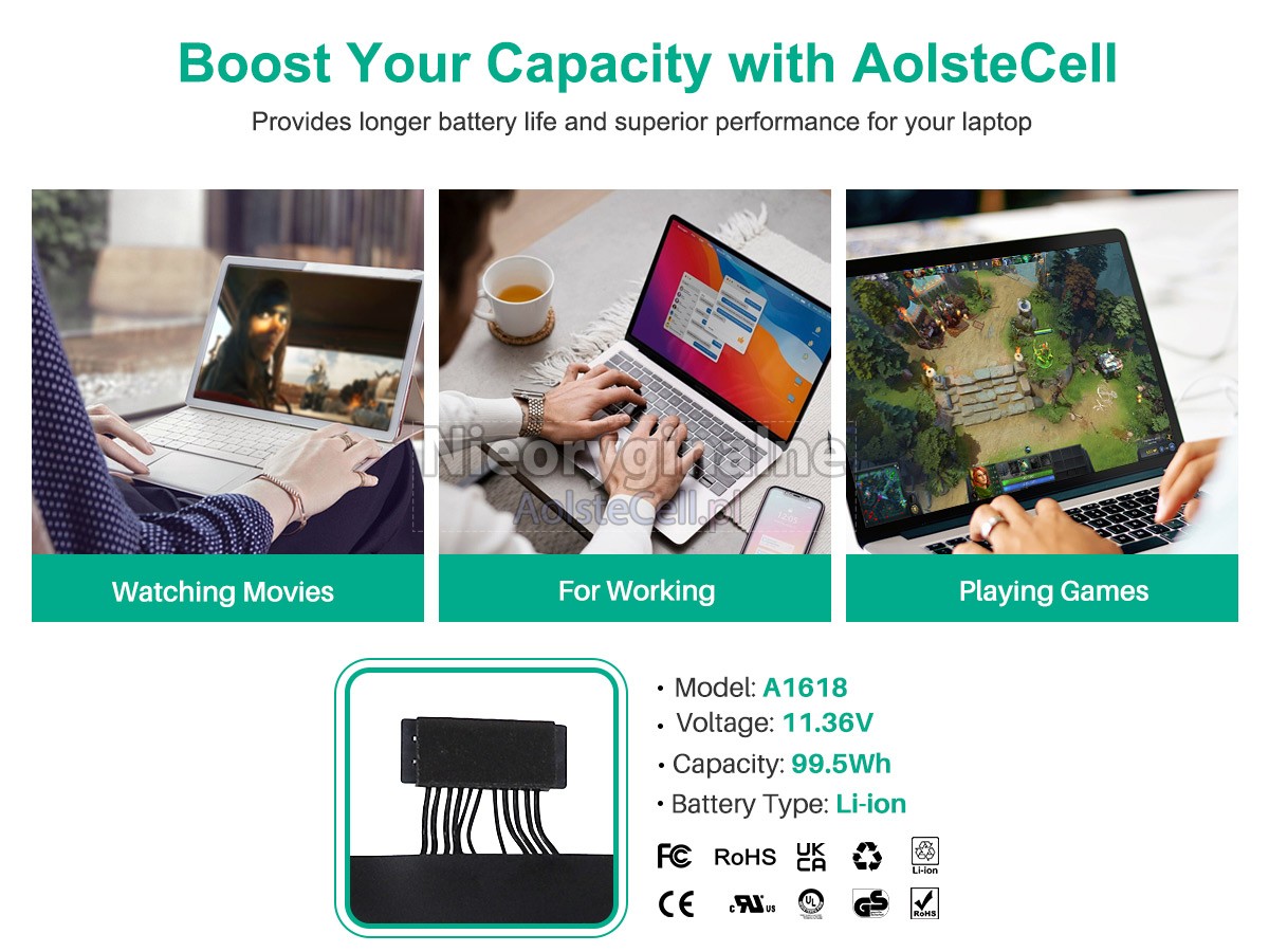 Przed zakupem baterii znajdź numer katalogowy starej baterii lub dokładną nazwę modelu Laptop (np. „MacBook Pro 15.4 inch Retina MJLU2LL/A*”) i porównaj ją ze specyfikacjami produktu i tabelą kompatybilności. Po drugie, porównaj kształt starej baterii ze zdjęciami naszych produktów, aby upewnić się, że są takie same.