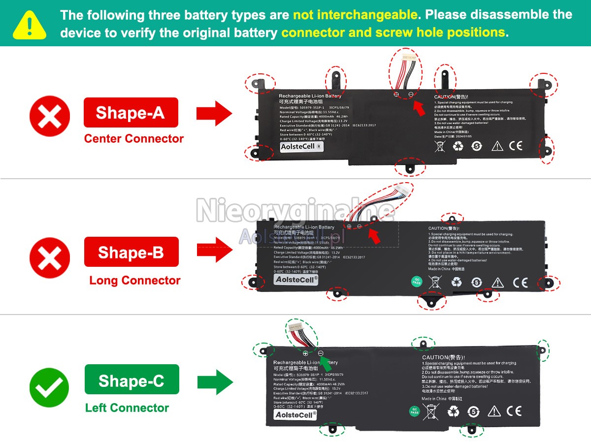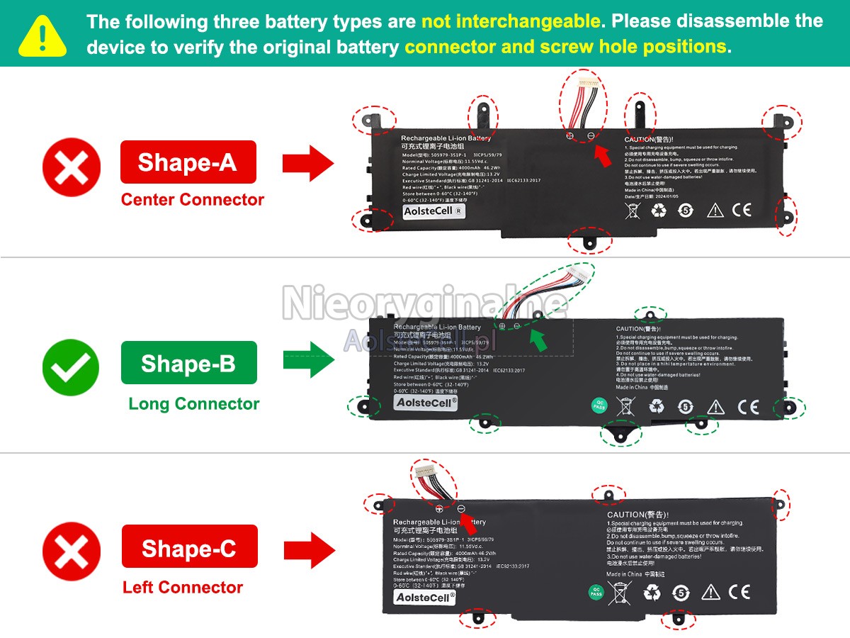 Przed zakupem baterii znajdź numer katalogowy starej baterii lub dokładną nazwę modelu (np. „505979-3S1P-1(3icp5/59/79)”) i porównaj ją ze specyfikacjami produktu i tabelą kompatybilności. Po drugie, porównaj kształt starej baterii ze zdjęciami naszych produktów, aby upewnić się, że są takie same.