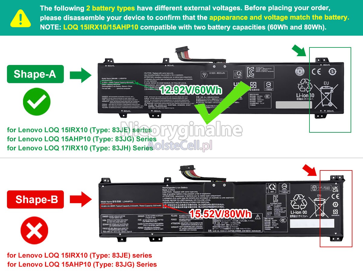 Przed zakupem baterii znajdź numer katalogowy starej baterii lub dokładną nazwę modelu (np. „LOQ 15IRX10-83JE005LGE”) i porównaj ją ze specyfikacjami produktu i tabelą kompatybilności. Po drugie, porównaj kształt starej baterii ze zdjęciami naszych produktów, aby upewnić się, że są takie same.