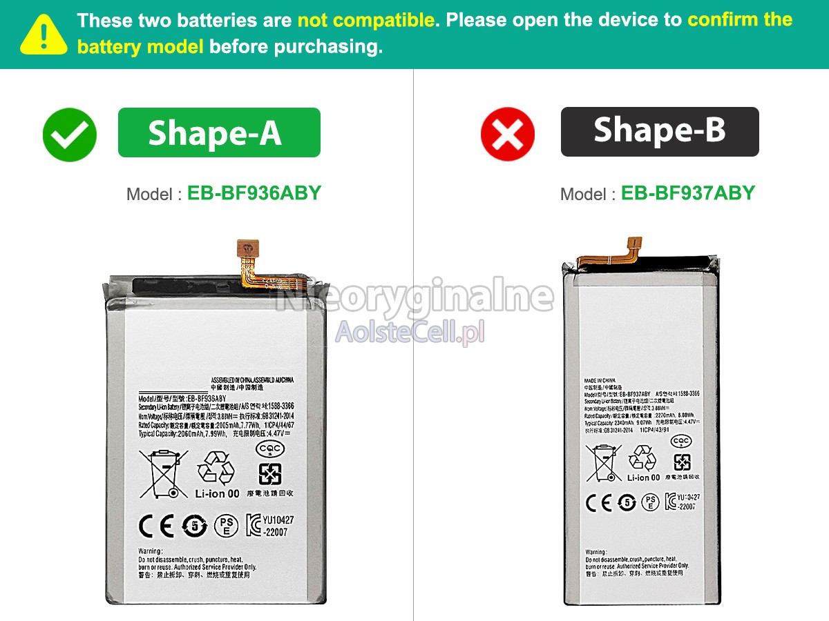 Przed zakupem baterii znajdź numer katalogowy starej baterii lub dokładną nazwę modelu (np. „Galaxy Z Fold 4 SM-F936U1”) i porównaj ją ze specyfikacjami produktu i tabelą kompatybilności. Po drugie, porównaj kształt starej baterii ze zdjęciami naszych produktów, aby upewnić się, że są takie same.